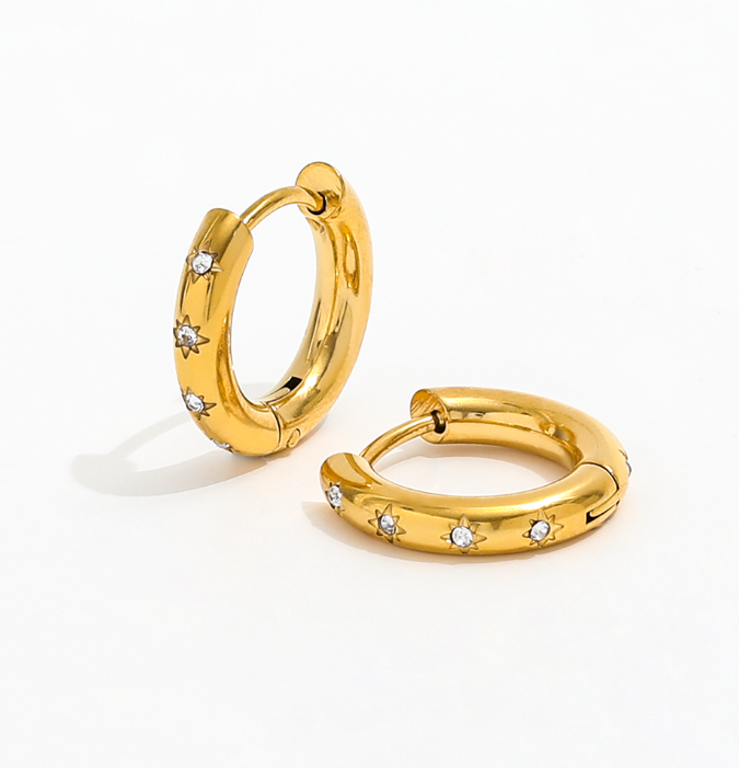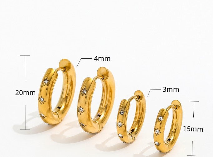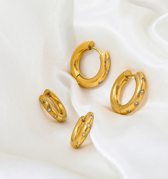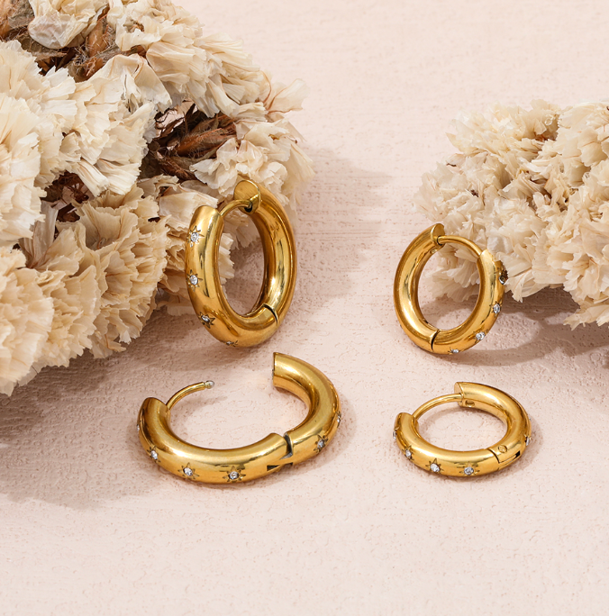 Die STELARA Ohrringe sind auffällige Creolen aus hochwertigem, wasserfestem Edelstahl – verziert mit funkelnden Starburst-Zirkonia, die an kleine Sternexplosionen erinnern. Ihr chunky Design trifft auf strahlenden Glanz und verleiht jedem Outfit ein kraftvolles Statement. Für alle, die Eleganz mit einem Hauch kosmischem Glamour kombinieren möchten – bold, funkelnd, unübersehbar.